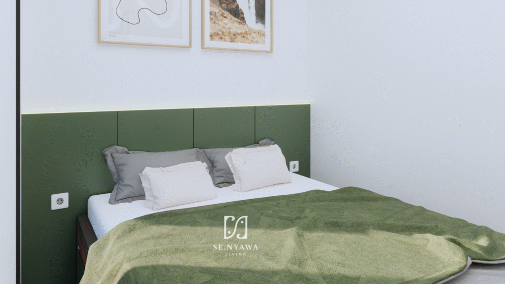 Detail pengerjaan di Master Bedroom mencakup pembuatan wardrobe, working desk, bed divan, nakas, dan headboard busa. Sementara untuk Guest Bedroom, kami melengkapi ruangan dengan wardrobe, bed divan, serta headboard tali air.